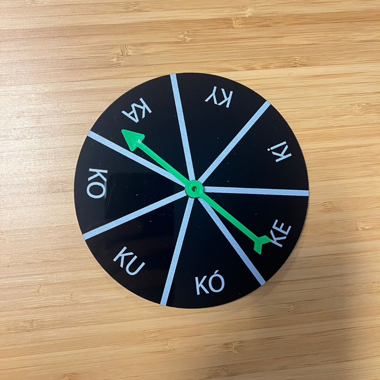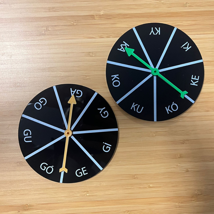 2 spinnery o średnicy 12,5 cm z nadrukowanymi paradygmatami sylab: KA, GA