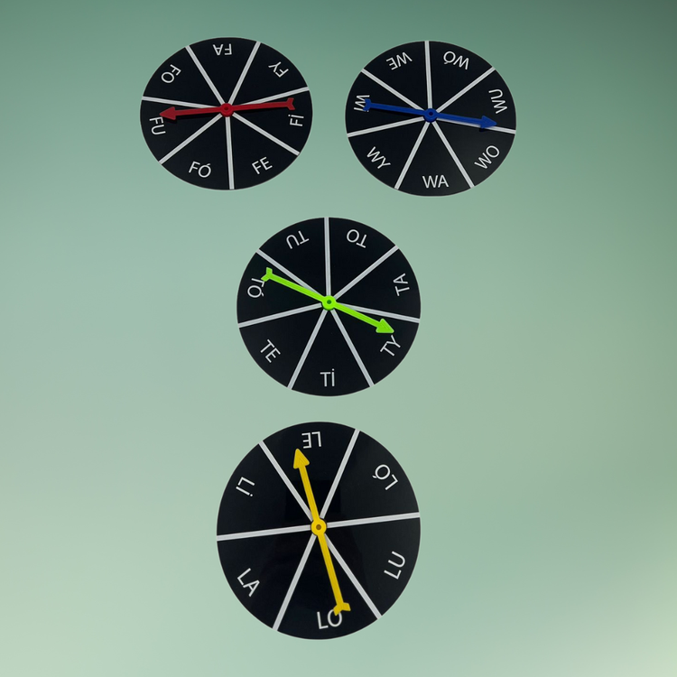 4 spinnery o średnicy 12,5 cm z nadrukowanymi paradygmatami sylab: LA, TA, FA, WA.