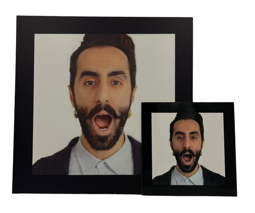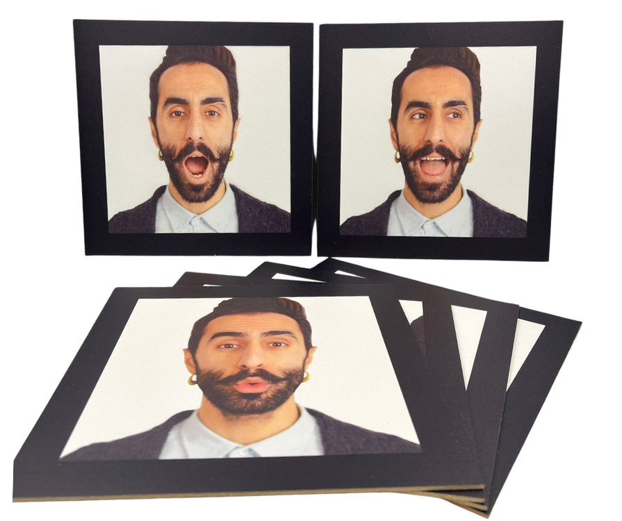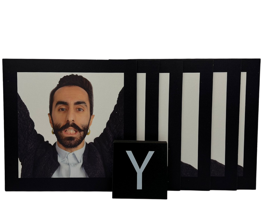 Zestaw składa się 6 zdjęć twarzy osoby wypowiadającej samogłoski, po 1 zdjęciu na każdą samogłoskę (A,O,U/Ó, E,I,Y) oraz 6 samogłosek. Zdjęcia i samogłoski są wydrukowane na planszach z wysokogatunkowej sklejki o wymiarach: